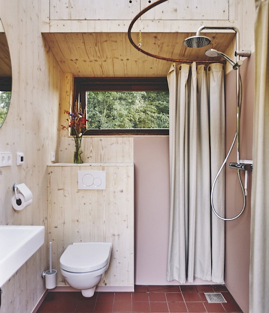 Het tweede huisje betreft een slaapkamer met een fijn 2-persoonsbed en een 1-persoonshoogslaper. De bedden zijn trouwens bij aankomst voor je opgemaakt. De 1-persoonshoogslaper raden we aan voor kinderen tot circa 16 jaar. Het derde huisje betreft een ruime badkamer met een toilet, douche, wastafel en vloerverwarming.