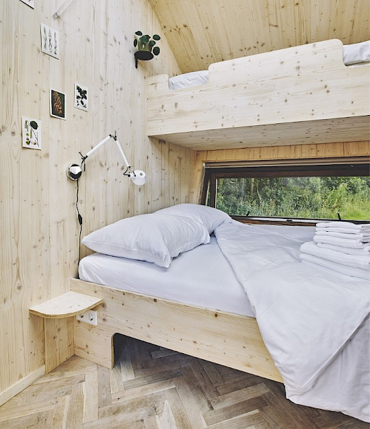 Het tweede huisje betreft een slaapkamer met een fijn 2-persoonsbed en een 1-persoonshoogslaper. De bedden zijn trouwens bij aankomst voor je opgemaakt. De 1-persoonshoogslaper raden we aan voor kinderen tot circa 16 jaar. Het derde huisje betreft een ruime badkamer met een toilet, douche, wastafel en vloerverwarming.