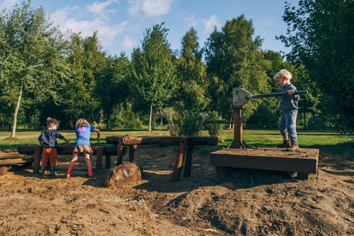 Laat de kinderen hier maar lekker rommelen. Het zand is schoon en de houten constructies bieden voldoende uitdaging om ze intensief bezig te houden. Laat ze de stapstenen over het water ontdekken, lekker vies worden rondom de waterpomp of zwieren aan de touwen langs de bosrand.