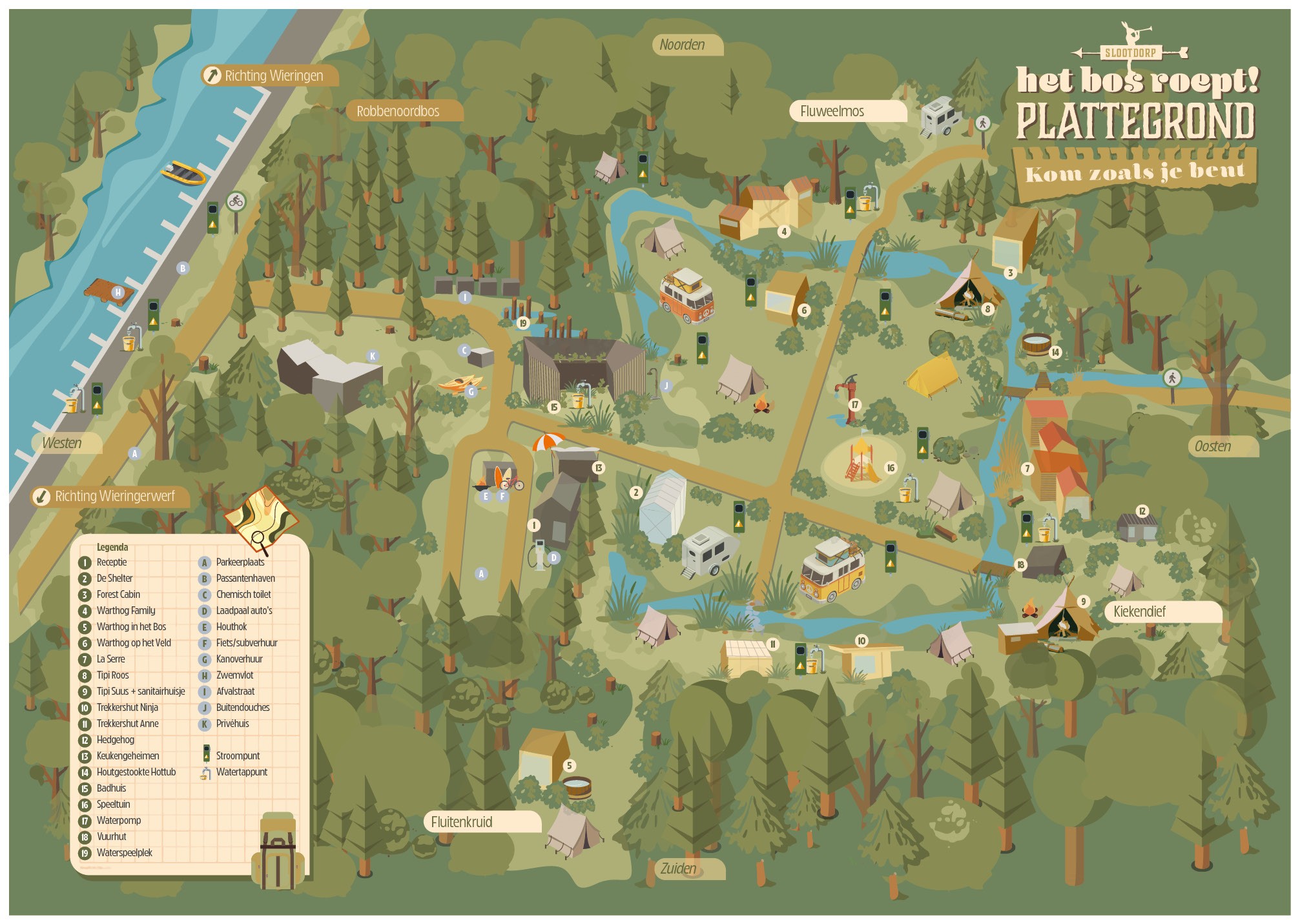 Op het bos roept! kampeer je in de natuur, in alle rust, omgeven door het Robbenoordbos. Het terrein is 3,6 hectare groot en ingericht voor tentkampeerders, campers, caravans, hangmatslapers en pleziervaartuigen in onze haven. Wij houden met iedereen rekening. Bij aankomst kies je helemaal zelf jouw favoriete kampeerplek. Groot, klein, campers, caravans en tenten, alles mag bij ons door elkaar staan (met of zonder 220V op de kampeerplek). Bekijk alvast onze ruime kampeerplekken, de ligging van onze accommodaties en de faciliteiten op de plattegrond hiernaast.