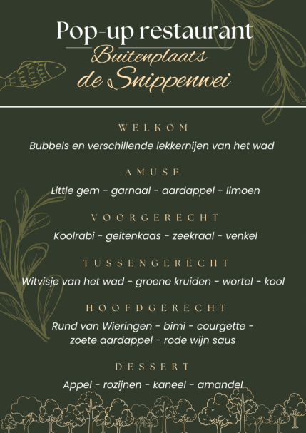 Deze herfst openen wij ter ere van de Culinaire Waddenweken, op vrijdag 24 oktober & zaterdag 25 oktober, de deuren van ons Pop-up Restaurant op het prachtige terrein van Buitenplaats de Snippenwei. Laat je tijdens deze culinaire avonden verrassen tijdens een 4-gangendiner, bereidt met eerlijke, lokale ingrediënten van het seizoen én ingrediënten van het wad. In een sfeervolle setting aan de rand van het Dijkgatbos geniet je van gerechten vol passie en smaak door chef Aram.